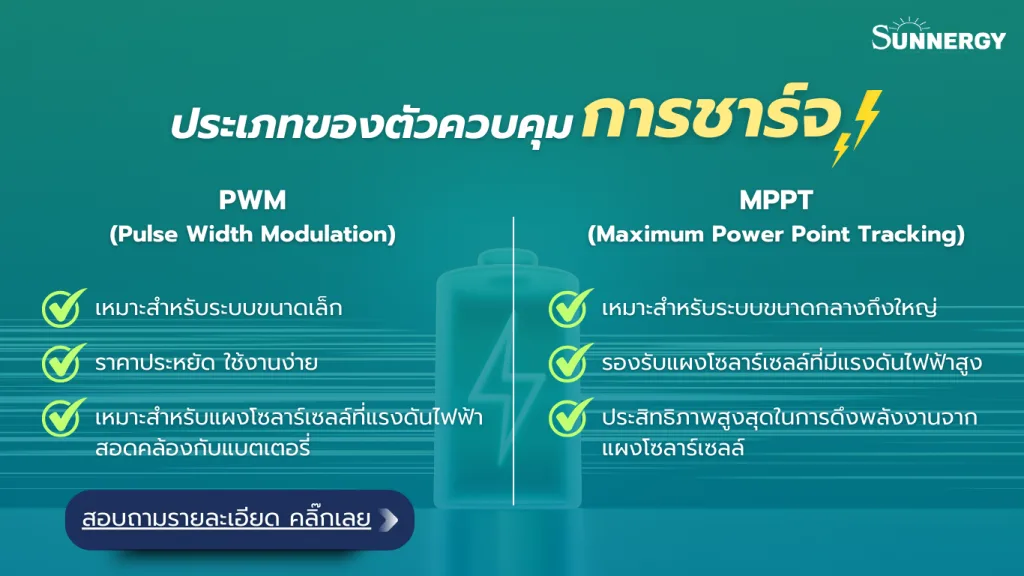 ตัวควบคุมการชาร์จ (Solar Charge Controller) เป็นอุปกรณ์สำคัญในระบบโซลาร์เซลล์ที่ช่วยจัดการและควบคุมกระแสไฟฟ้าที่ไหลจากแผงโซลาร์เซลล์ไปยังแบตเตอรี่ เพื่อป้องกันการชาร์จไฟเกินหรือการคายประจุที่มากเกินไป เพิ่มอายุการใช้งานของแบตเตอรี่และเพิ่มประสิทธิภาพการทำงานของระบบพลังงานแสงอาทิตย์
